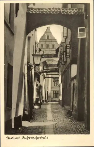 Ak Stralsund in Vorpommern, Bergermacherstraße, Blick auf Giebelhaus