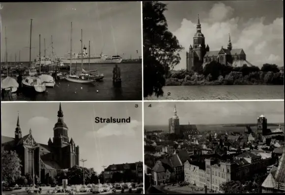 Ak Stralsund in Vorpommern, Hafen, Marienkirche, Ortsübersicht