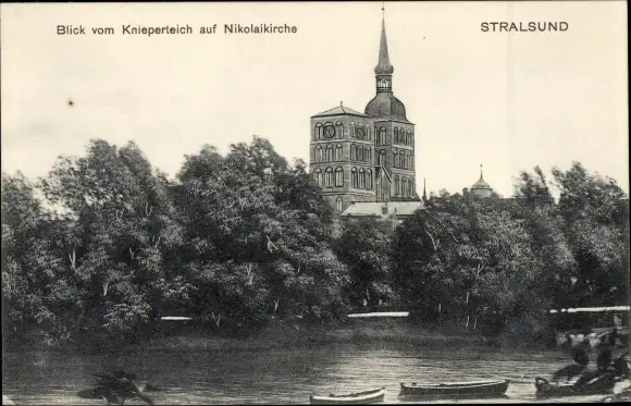 Ak Stralsund in Vorpommern, Knieperteich, Nikolaikirche, Boote