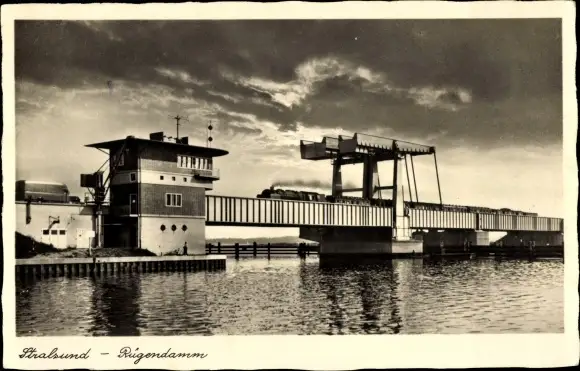 Ak Stralsund in Vorpommern, Rügendamm, Eisenbahnbrücke