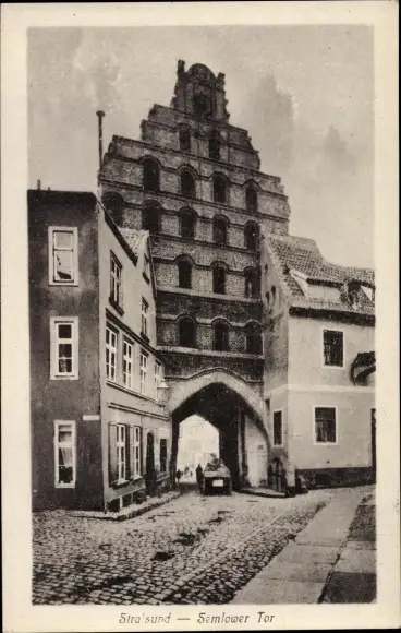 Ak Stralsund in Vorpommern, Semlower Tor, Giebelhaus, Fahrzeug