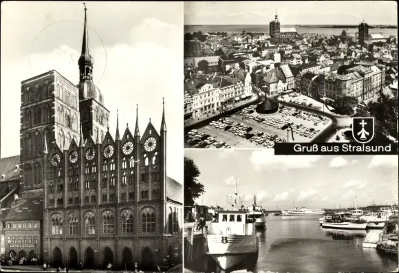 Ak Stralsund in Vorpommern, Wappen, Stadtansicht, Kirche, Hafen, Boote