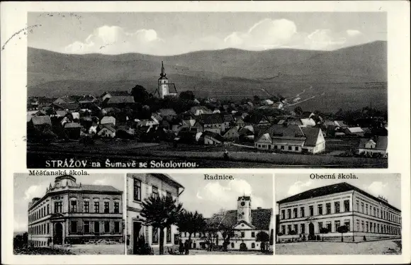 Ak Strážov na Sumave Region Pilsen, Schule, Rathaus, Totalansicht