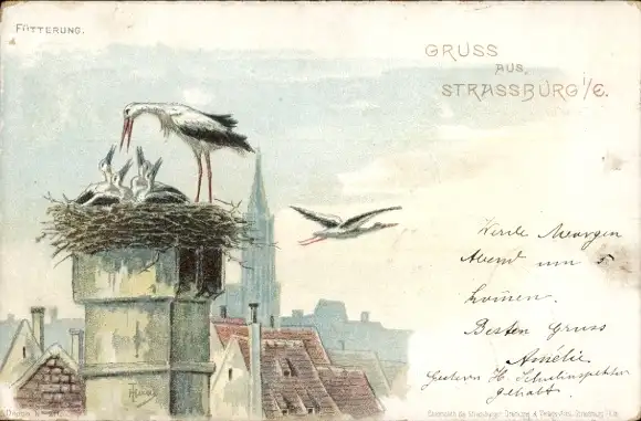 Ak Strasbourg Straßburg Elsass Bas Rhin, Teilansicht, Dächer, Störche, Storchennest