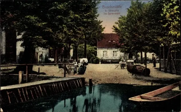 Ak Straupitz im Spreewald, Buschmühle, Boot