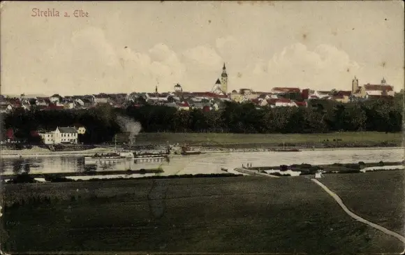 Ak Strehla an der Elbe Sachsen, Gesamtansicht, Dampfer