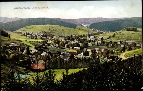 Ak Stützerbach Ilmenau Thüringer Wald, Totalansicht der Ortschaft, Berge