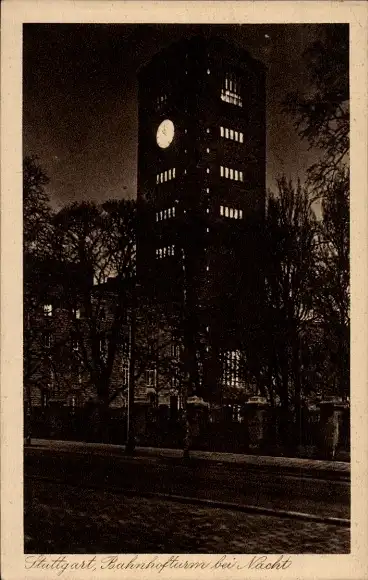 Ak Stuttgart in Württemberg, Bahnhofsturm bei Nacht
