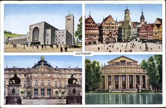 Ak Stuttgart in Württemberg, Hauptbahnhof, Marktplatz, Neues Schloss, Landestheater