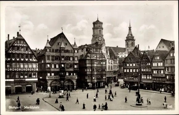 Ak Stuttgart in Württemberg, Marktplatz, Passanten, Fachwerkhäuser, Uhrturm