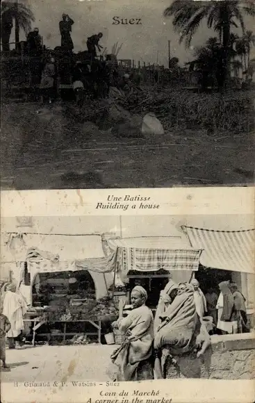 Ak Suez Ägypten, Ruilding a house, A corner in the market