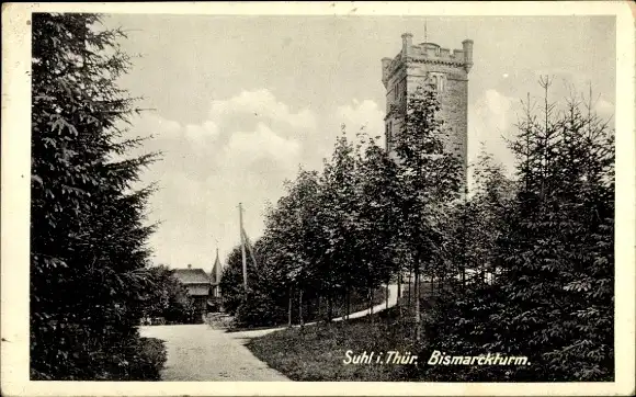 Ak Suhl in Thüringen, Bismarckturm, Wald, Straße, Wolken,