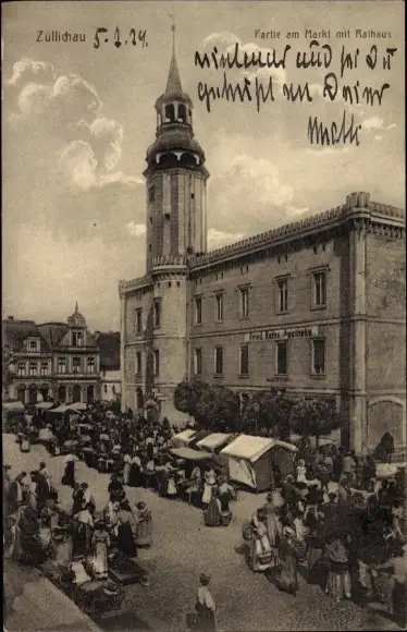 Ak Sulechów Züllichau Ostbrandenburg, Partie am Markt mit Rathaus, Apotheke