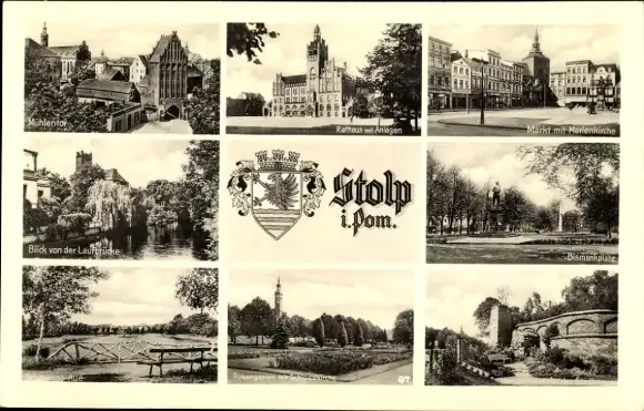 Ak Słupsk Stolp Pommern, Mühlentor, Bismarckplatz, Markt, Marienkirche, Rathaus
