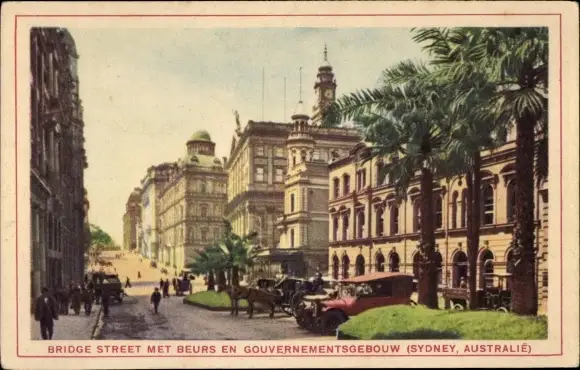 Ak Sydney Australien, Bridge Street mit Beurs en Gouvernementsgebouw