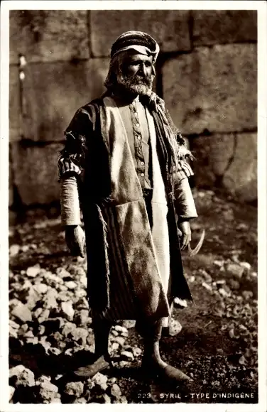 Ak Syrien, Einheimische in traditioneller Kleidung mit Sense