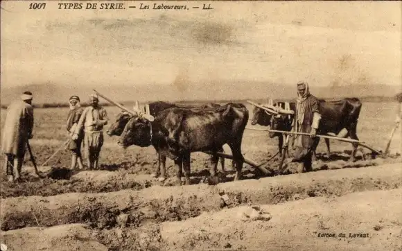Ak Syrien, syrische Feldarbeiter mit Ochsenpflug