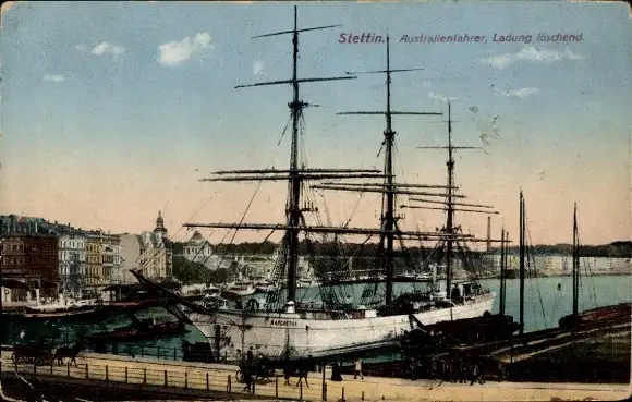 Ak Szczecin Stettin Pommern, Australienfahrer, Ladung löschend, Segelschiff
