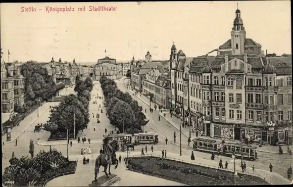 Ak Szczecin Stettin Pommern, Königsplatz, Stadttheater, Straßenbahnen