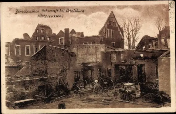 Ak Szczytno Ortelsburg Ostpreußen, Zerschossenes Gebäude