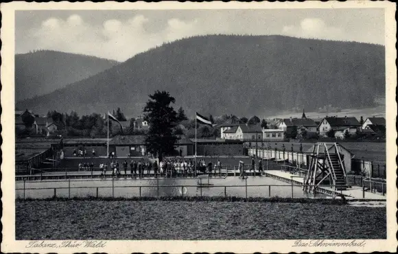 Ak Tabarz Thüringer Wald, Blick auf das Sommerbad,Wald