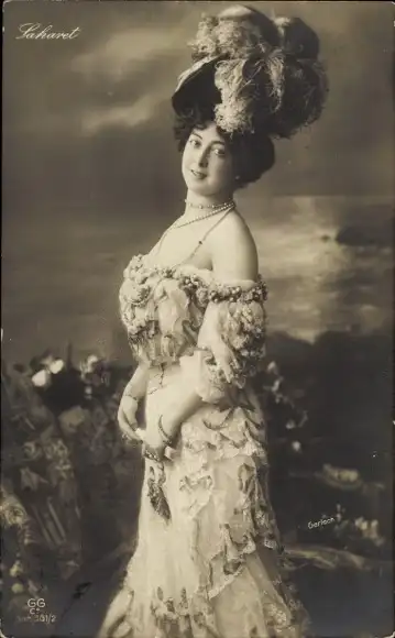 Ak Tänzerin Saharet, Standportrait, Kleid, Federhut