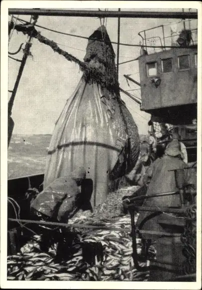 Ak Tag des Hochseefischers, Fangnetz wird an Bord geleert