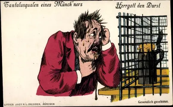 Ak Tantalusqualen eines Münchners, Herrgott den Durst, Bierkrug hinter Gittern