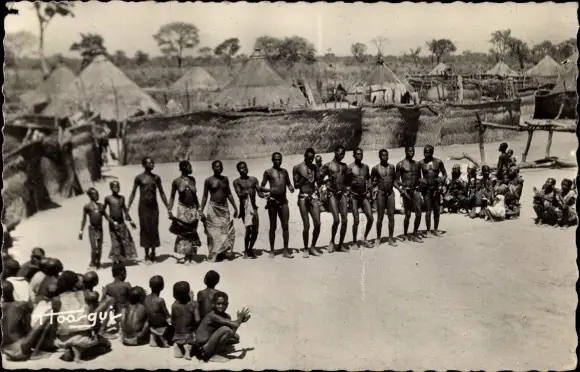 Ak Tanzende Afrikaner, Afrikanisches Dorf, Wohnhäuser, Strohdächer