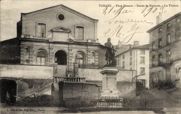 Ak Tarare Rhône, Place Denave, Statue von Simonet, Theater