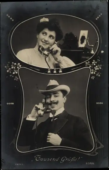 Ak Tausend Grüße, Mann und Frau am Telefon