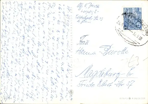 Zustand, siehe Scan, gelaufen, 1958- Bahnpoststempel Leipzig Stralsund - ca 11 cm X 15 cm