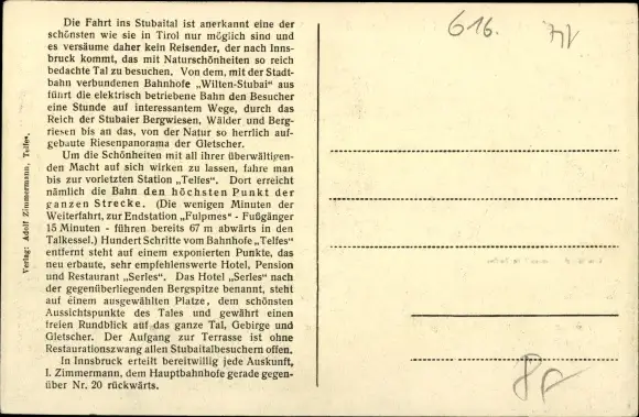 Ak Telfes im Stubai in Tirol, Hotel Serles, Talansicht