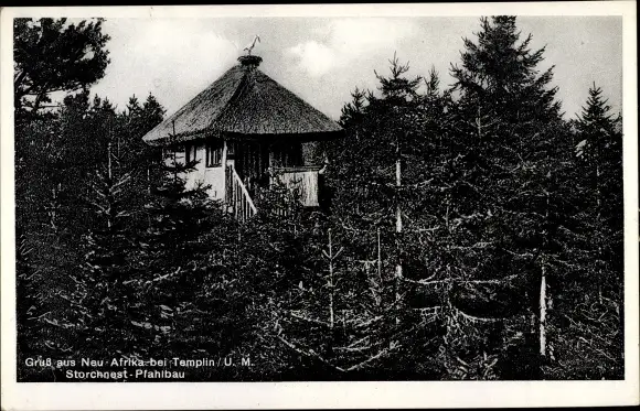 Ak Templin Uckermark, Neu Afrika, Storchnest Pfahlbau