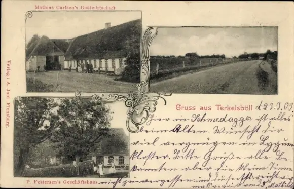 Ak Terkelsbøl Terkelsböll Dänemark, Mathias Carlsens Gastwirtschaft, Festersens Geschäftshaus