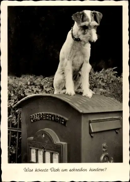 Ak Terrier sitzt auf einem Postbriefkasten