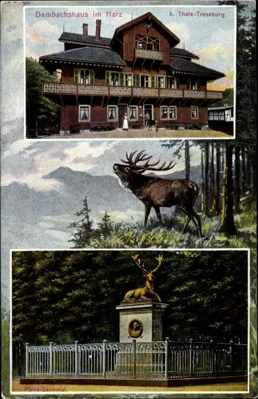 Ak Thale im Harz, Dambachshaus, Hirschdenkmal, röhrender Hirsch
