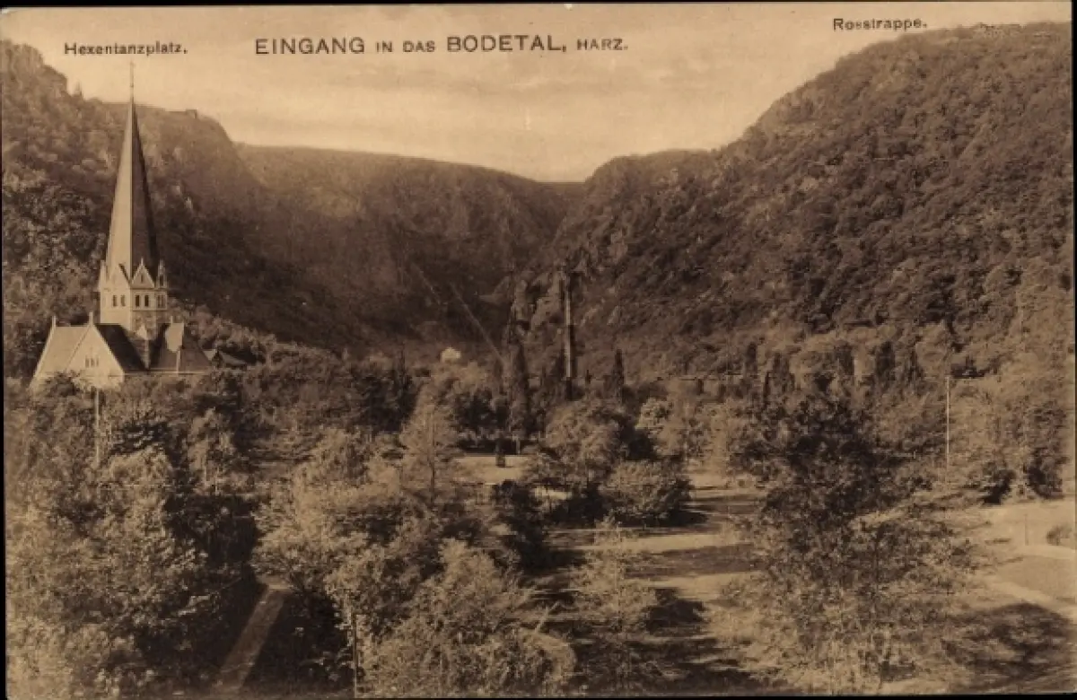 Ak Thale im Harz, Hexentanzplatz, Rosstrappe, Kirche, Bodetal