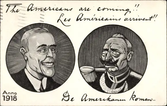 Ak The Americans are coming, Woodrow Wilson, Karikatur Kaiser Wilhelm II., Anno 1918