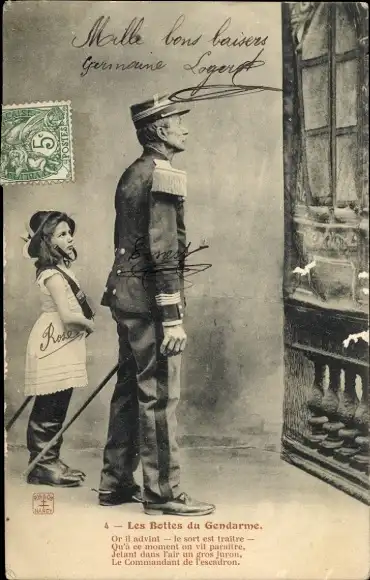 Ak Theaterszene Les Bottes du Gendarme, Mann in Uniform, Mädchen mit Säbel