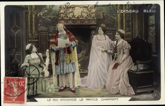 Ak Theaterszene, l'Oiseau Bleu, Le Roi Annonce le Price Charmant