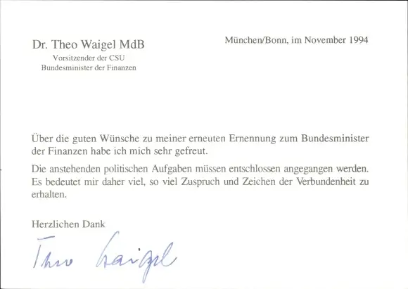 Ak Theo Waigel, Politiker, Danksagung, Autogramm