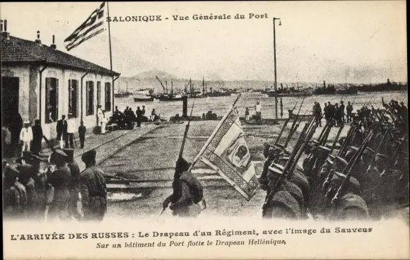 Ak Thessaloniki Griechenland, Vue General du Port, Arrivée des Russes, Drapeau d'un Regiment