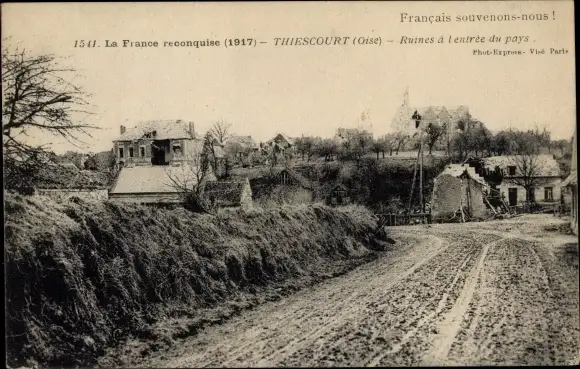 Ak Thiescourt Oise, Ruines a l'Entree du pays