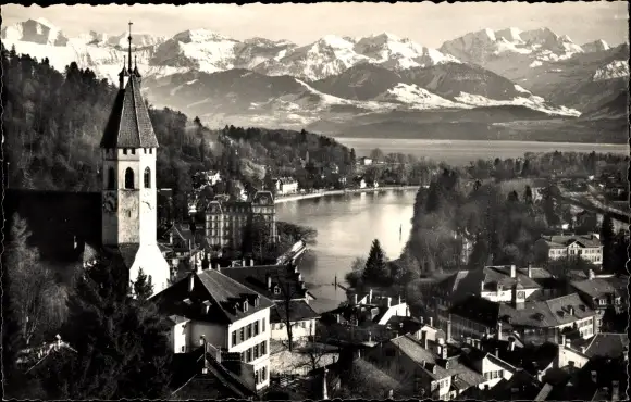 Ak Thun Kanton Bern Schweiz, Panorama, Kirche, Alpenkette