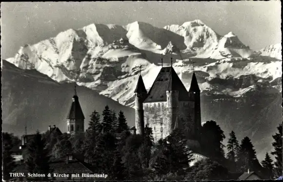 Ak Thun Kanton Bern Schweiz, Schloss, Kirche, Blümlisalp