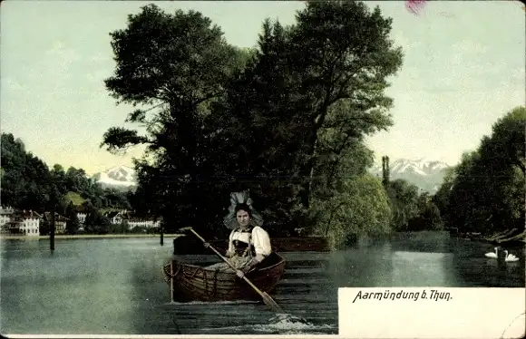 Ak Thun Kt. Bern Schweiz, Aarmündung, Frau in Tracht in Ruderboot