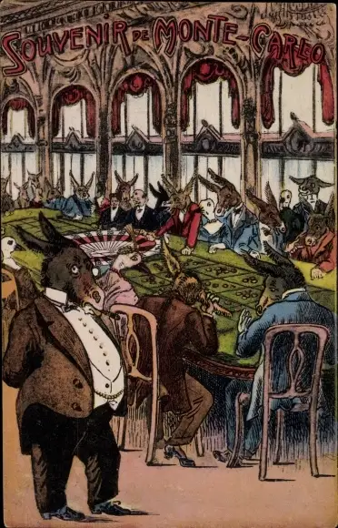 Ak Tiere im Casino, Roulette, Vermenschlichte Esel, Glücksspiele