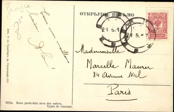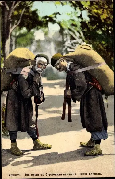 Ak Tiflis georgisch, Zwei Träger mit Weinschläuchen