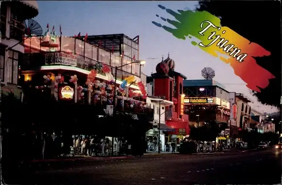 Ak Tijuana Mexiko, Baja California, Straßenpartie, Festschmuck, Geschäfte